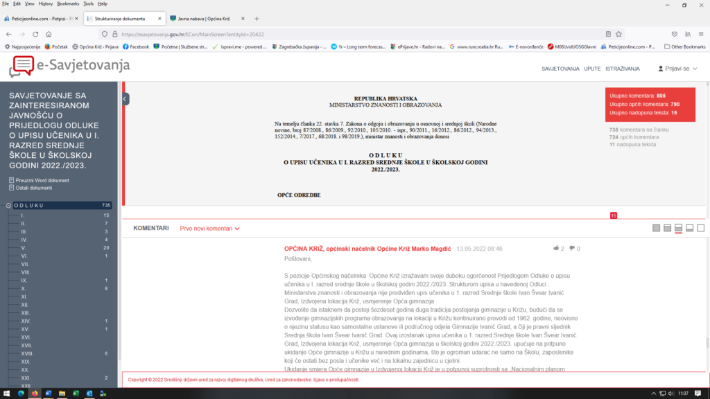 S pozicije Općinskog načelnika Općine Križ, danas sam podnio i službeni komentar u sklopu Savjetovanja sa zainteresiranom javnošću na Prijedlog Odluke o upisu učenika u I. razred srednje škole u školskoj godini 2022./2023. Ministarstva znanosti i obrazovanja . Još smo jednom izrazili neslaganje s predloženom strukturom upisa u navedenoj Odluci. Svoj komentar na spomenuti Prijedlog Odluke još danas i sutra možete dati i Vi. Link na e-savjetovanje je u prilogu.